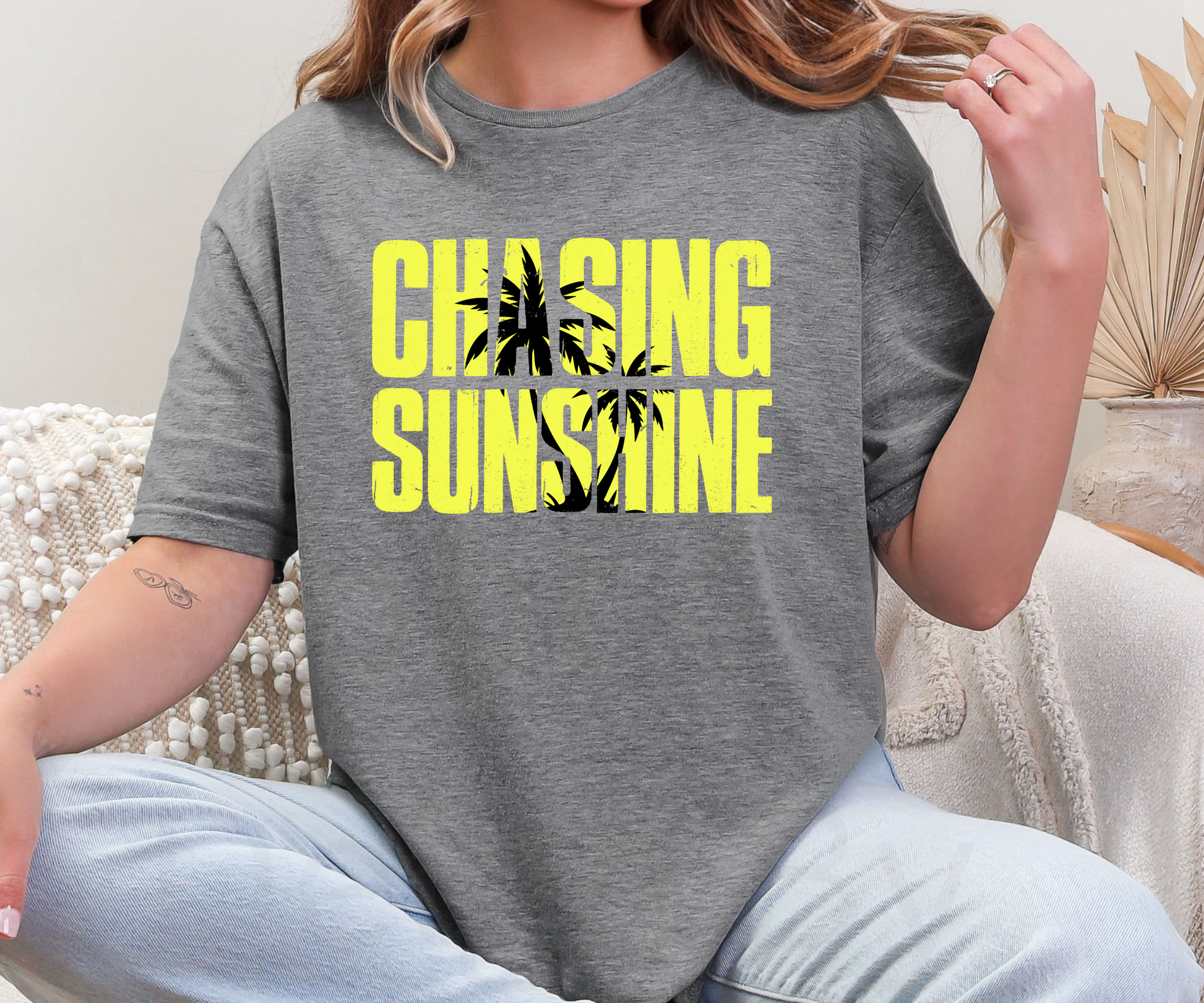 Embrace sunny days with the Chasing Sunshine Tee, featuring a charming design of palm trees and the uplifting phrase "chasing sunshine." Crafted for comfort and style, this tee is perfect for warm weather adventures and casual outings, helping you carry a bright, positive vibe wherever you go.