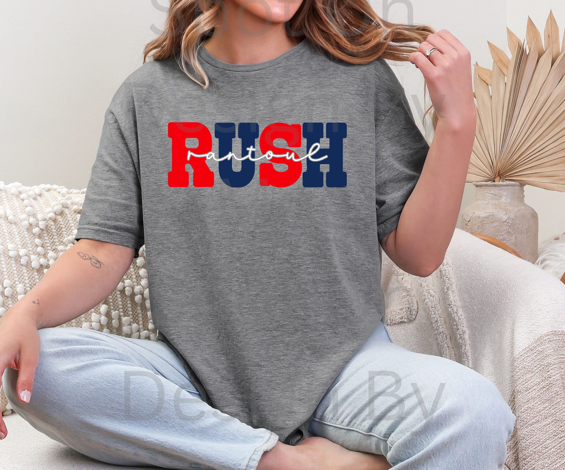 Show your support for the Rantoul Rush softball and baseball teams with this expertly crafted Red and Navy Letter Tee. Designed for comfort and durability, it features bold team colors and lettering that proudly represent your favorite local athletes. Perfect for game days or casual wear, this tee combines style with team spirit to keep you looking sharp while cheering on the Rush.