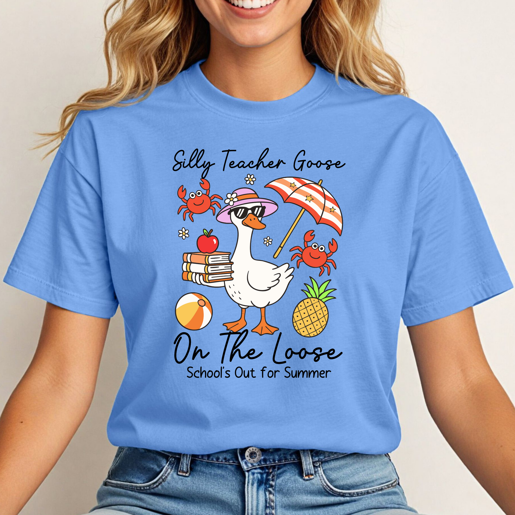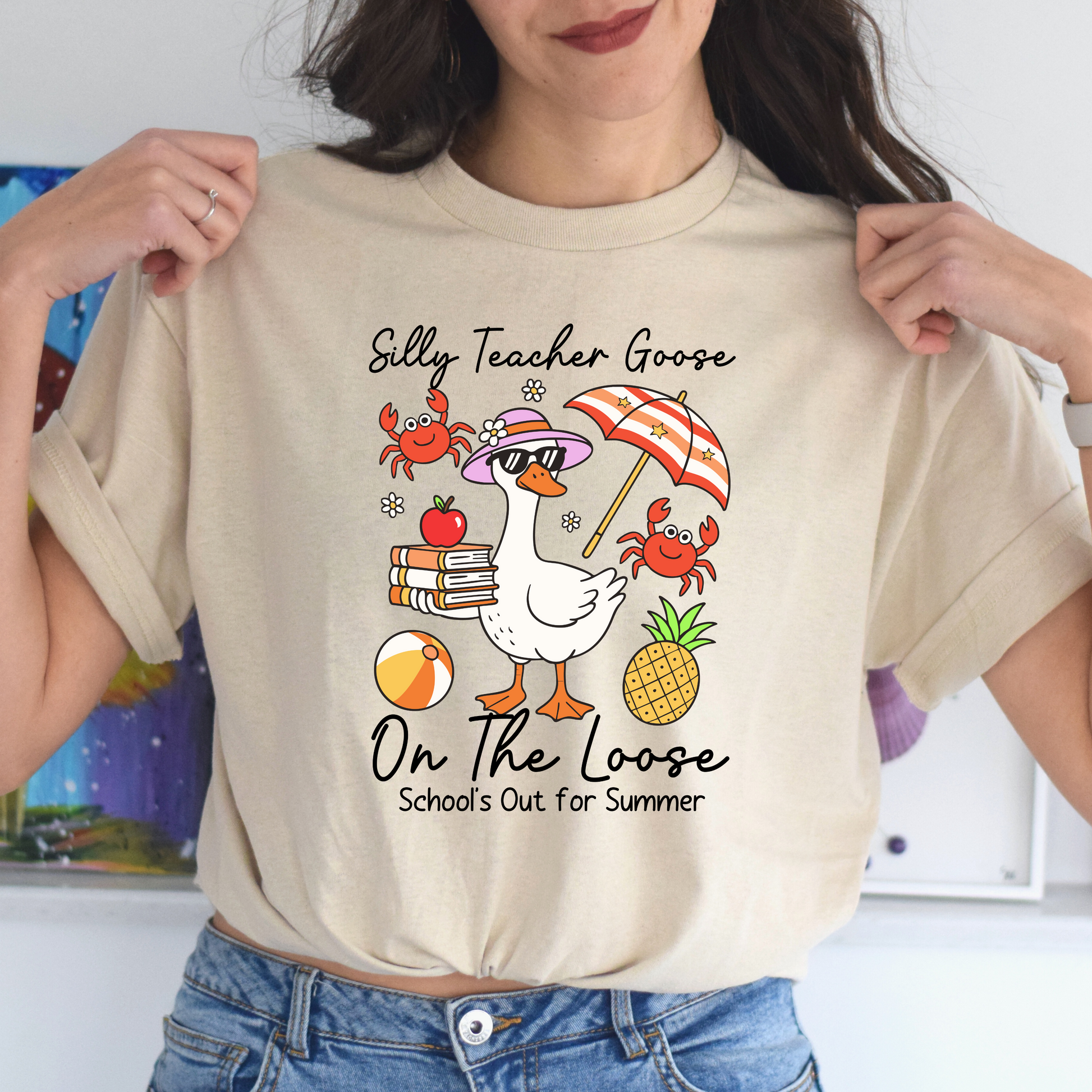 Find the perfect way to celebrate summer break with this "Silly Teacher Goose On The Loose School's Out For The Summer" tee. Made for teachers, this fun shirt is the perfect way to show off your last day of school excitement while also enjoying the benefits of a well-deserved break.